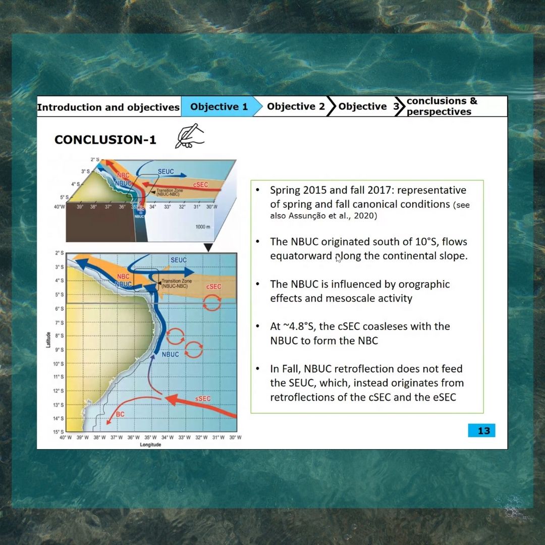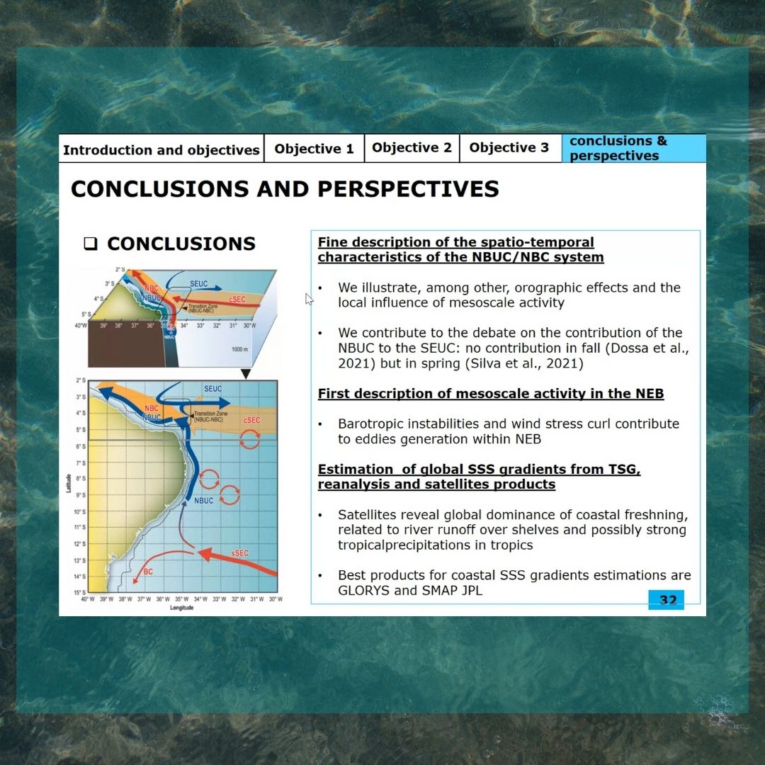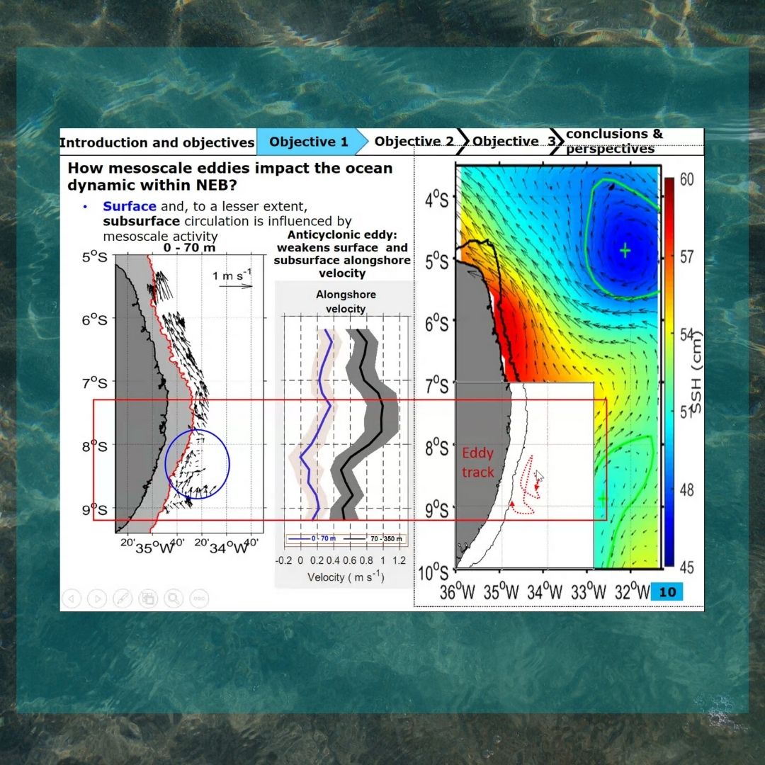 O pesquisador é vinculado ao Laboratório de Oceanografia Física Estuarina e Costeira(LOFEC), na UFPE, e também faz parte do LMI Tapioca. O objetivo do estudo é caracterizar a dinâmica oceânica próxima à superfície, incluindo a ocorrência e as características dos vórtices de mesoescala ao largo da costa do Nordeste do Brasil. Além disso, a tese visa analisar os gradientes de salinidade da superfície do mar costeiro em escala global, com foco especial em áreas-chave, incluindo o Nordeste do Brasil.