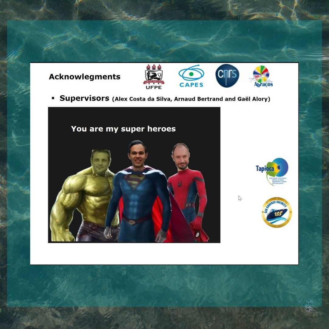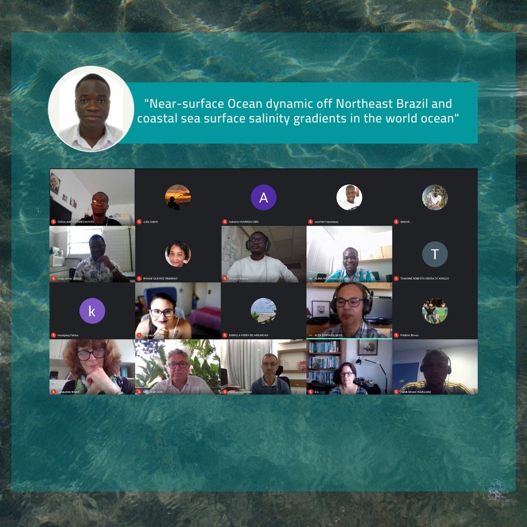 No dia 26 de maio, Nathanael Dossa foi aprovado em sua defesa de tese de doutorado ititulada “Near-surface Ocean dynamic off northeast Brazil and coastal sea surface salinity gradients in the world ocean”. A defesa foi transmitida online devido a pandemia de SARS-CoV-2, com a presença de mais de 30 participantes e a banca. A banca de avaliação do estudo foi composta por: Moacyr Araujo (UFPE), Fabrice Hernandez (IRD), Carmen Limongi (UFPE), Jacqueline Boutin (CNRS), Doris Veleda (UFPE), Frederic Bonou (UNSTIM-Benin). Orientadores da pesquisa: Alex Costa da Silva; Arnaud Bertrand e Gaël Alory.